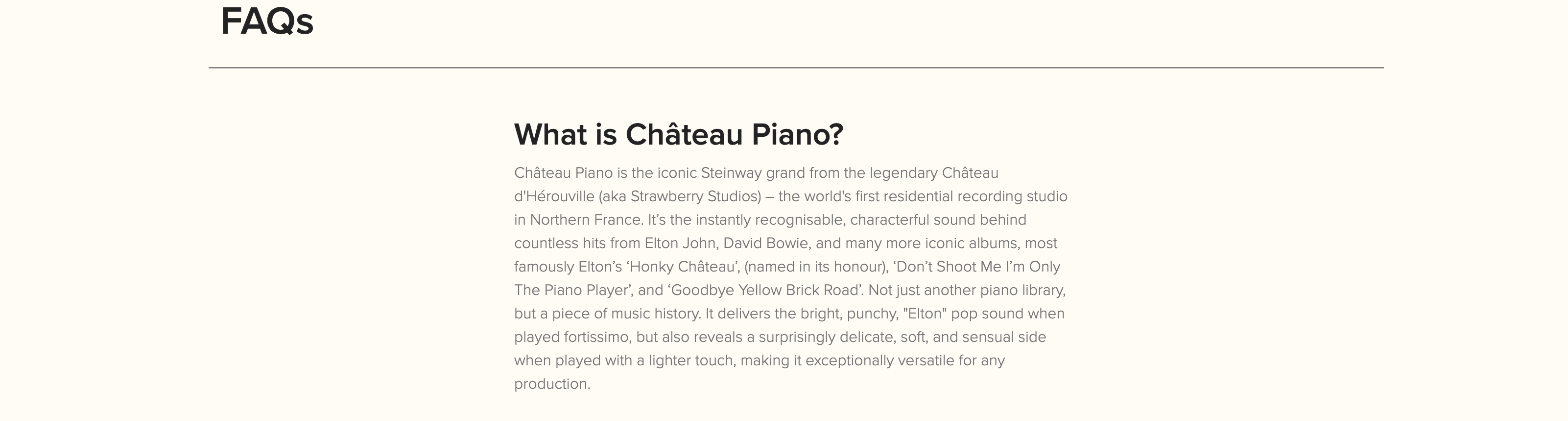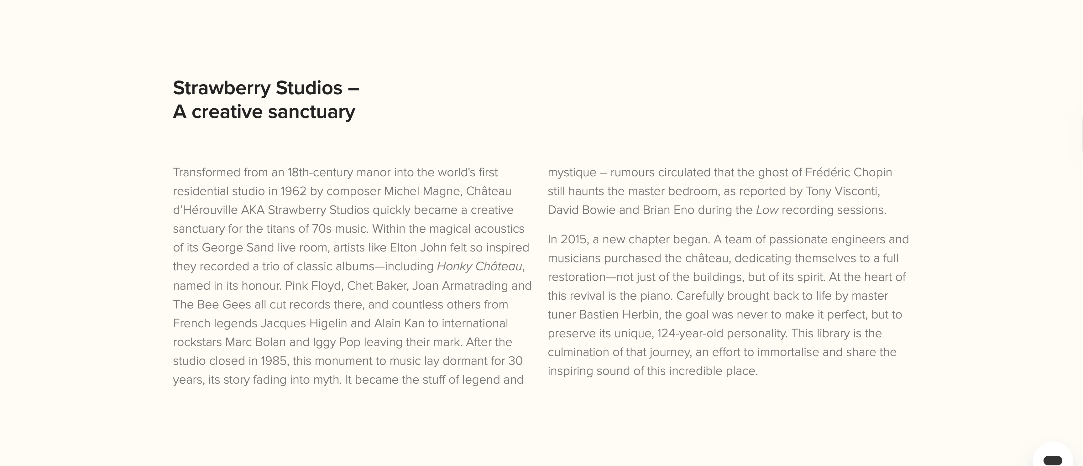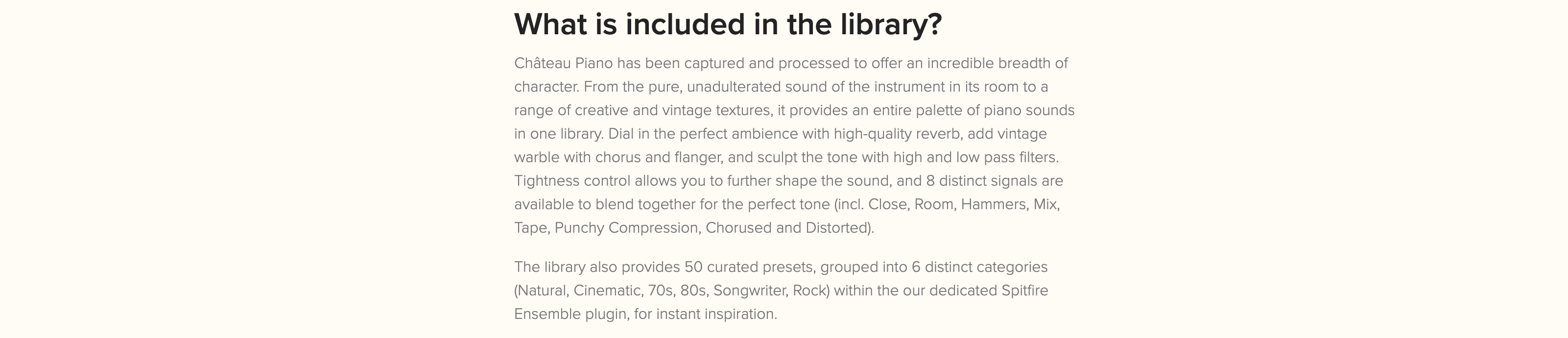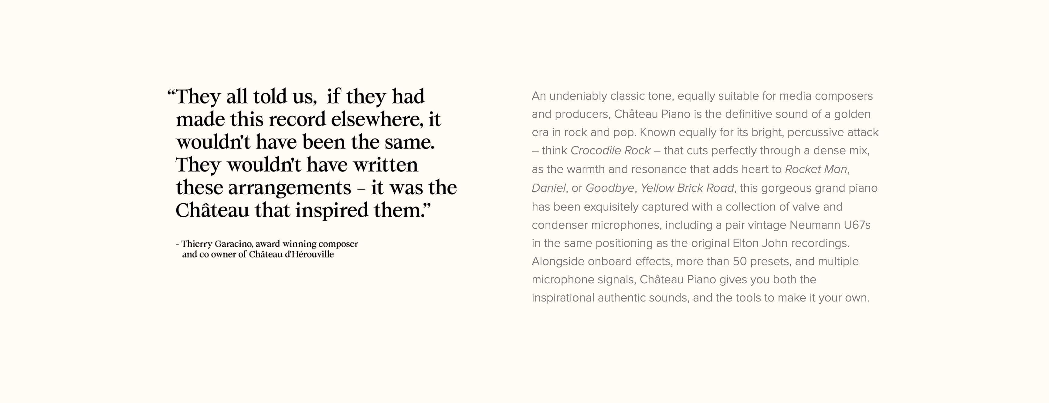 The pure, unadulterated, and stunningly authentic sound of the Steinway B, as it exists in the legendary Château. Perfect for delicate melodies and true-to-life performances.