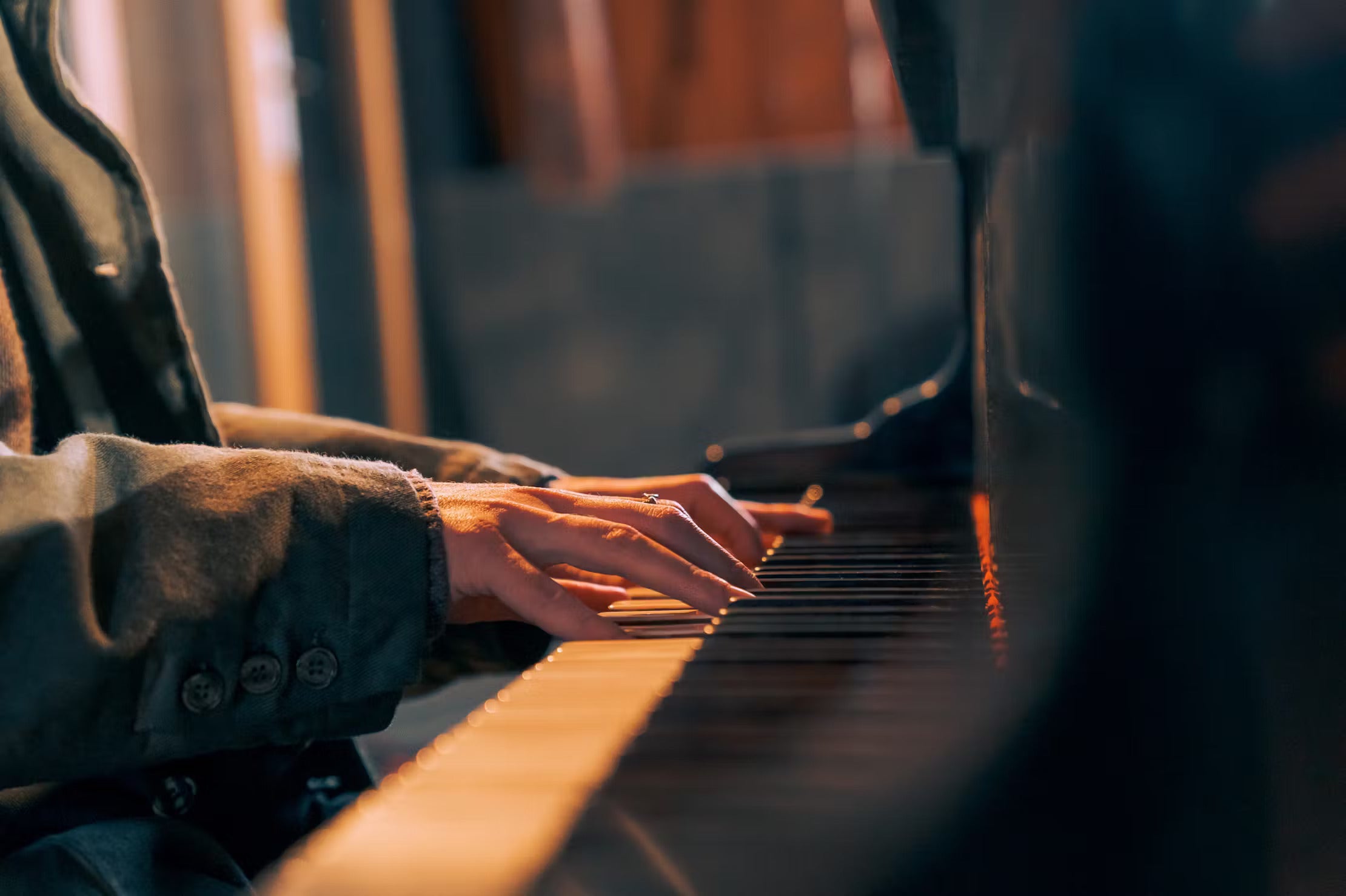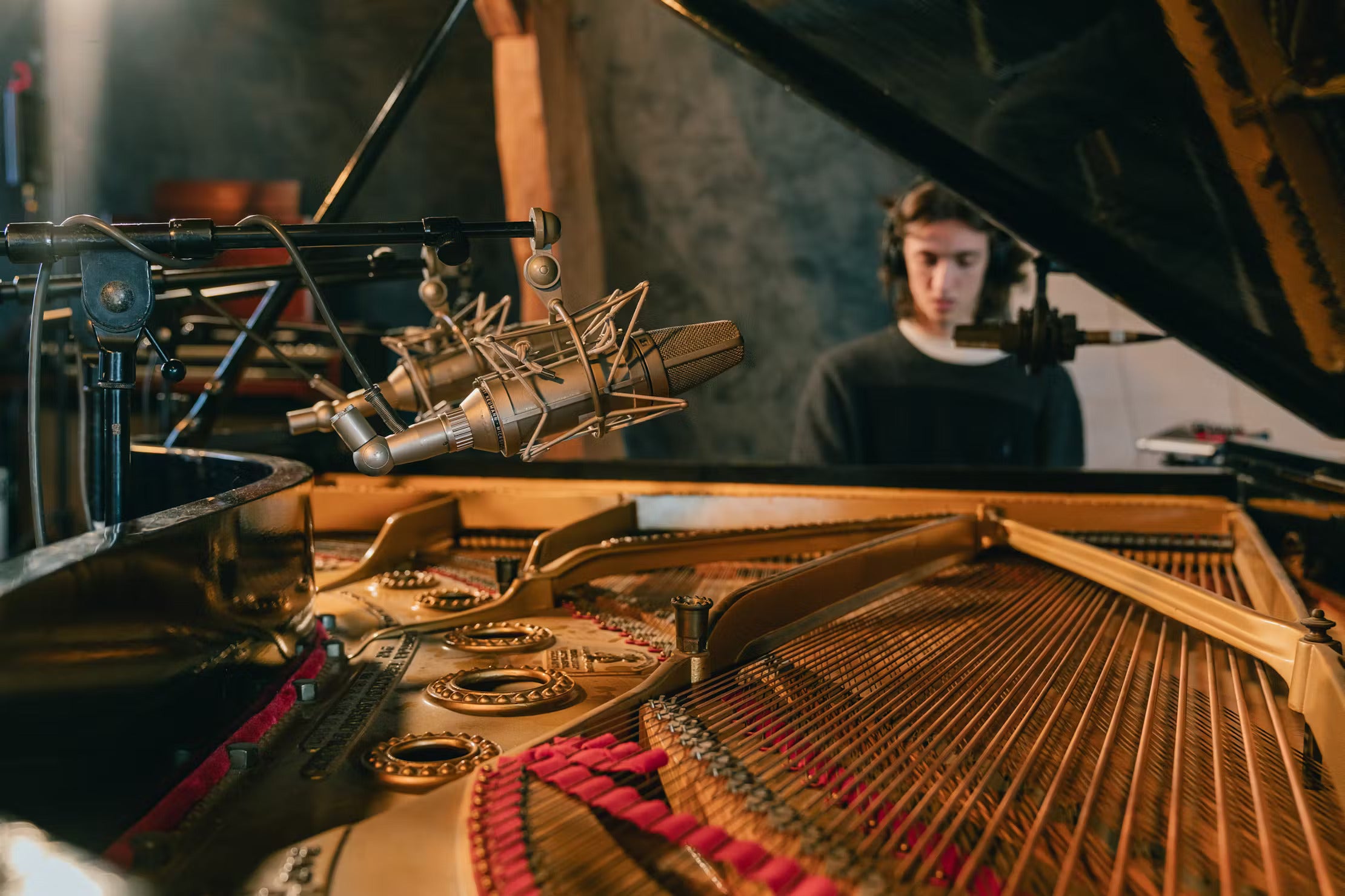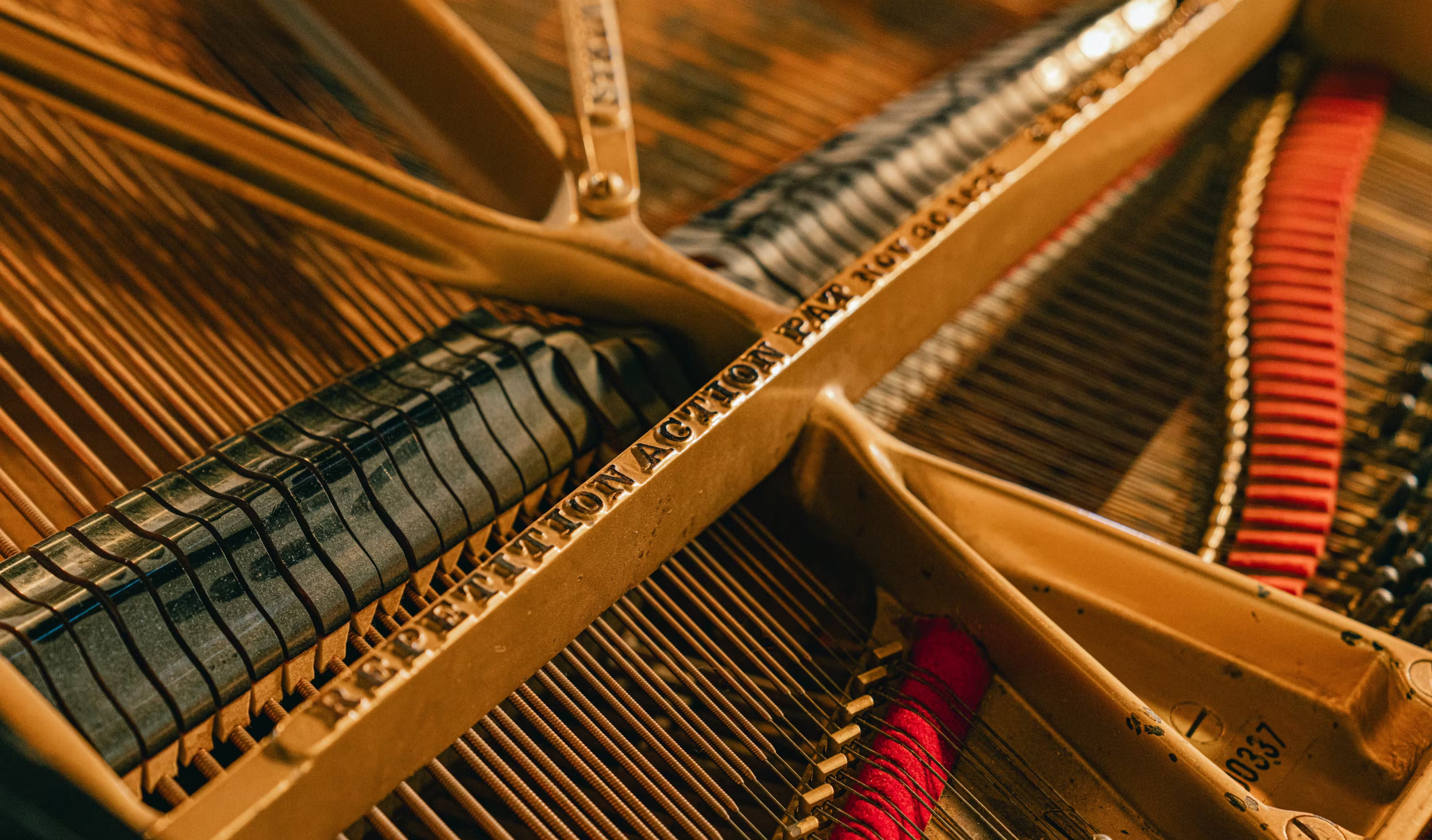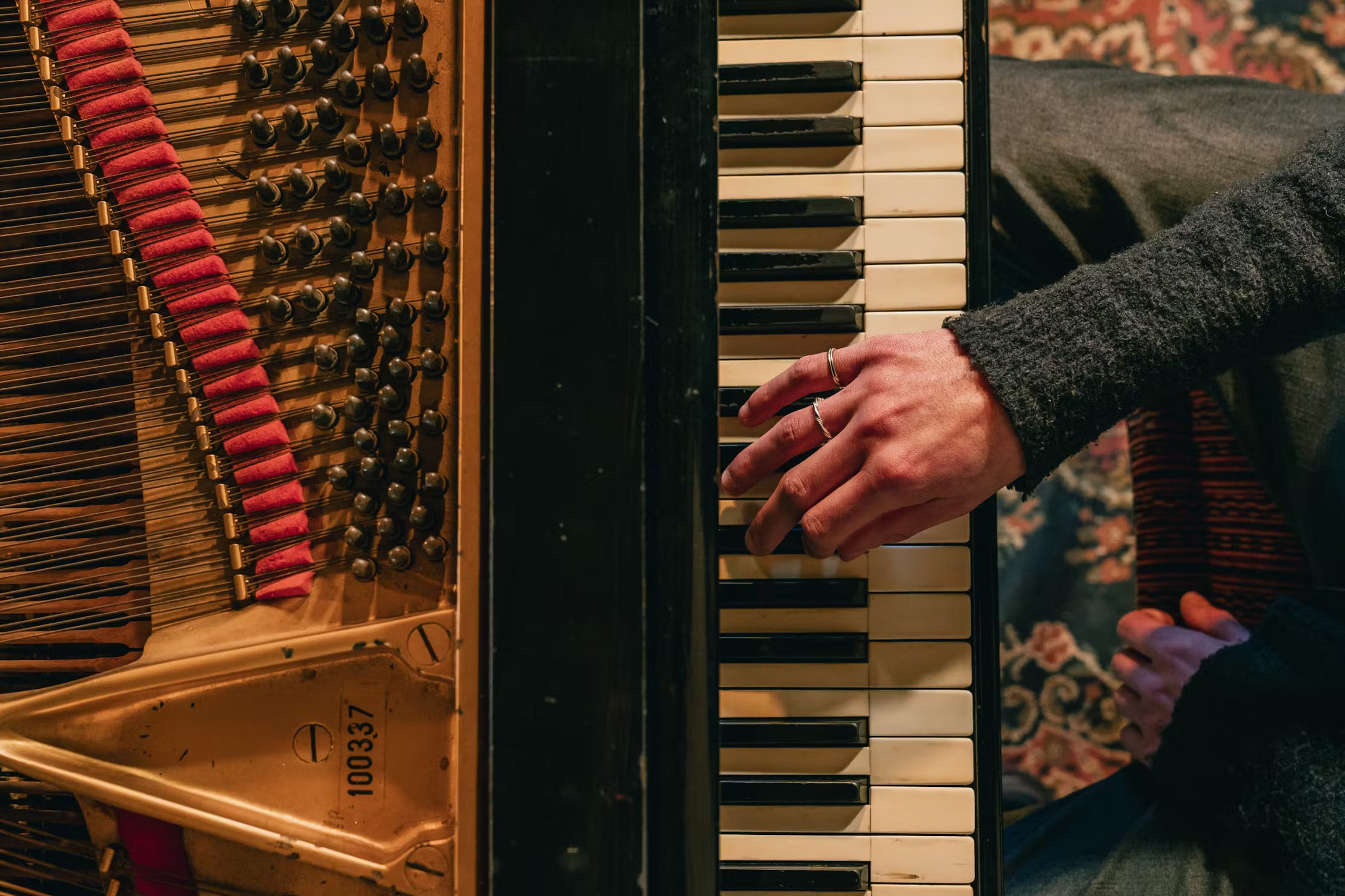 A detailed and intimate perspective, capturing the direct sound of the piano strings.